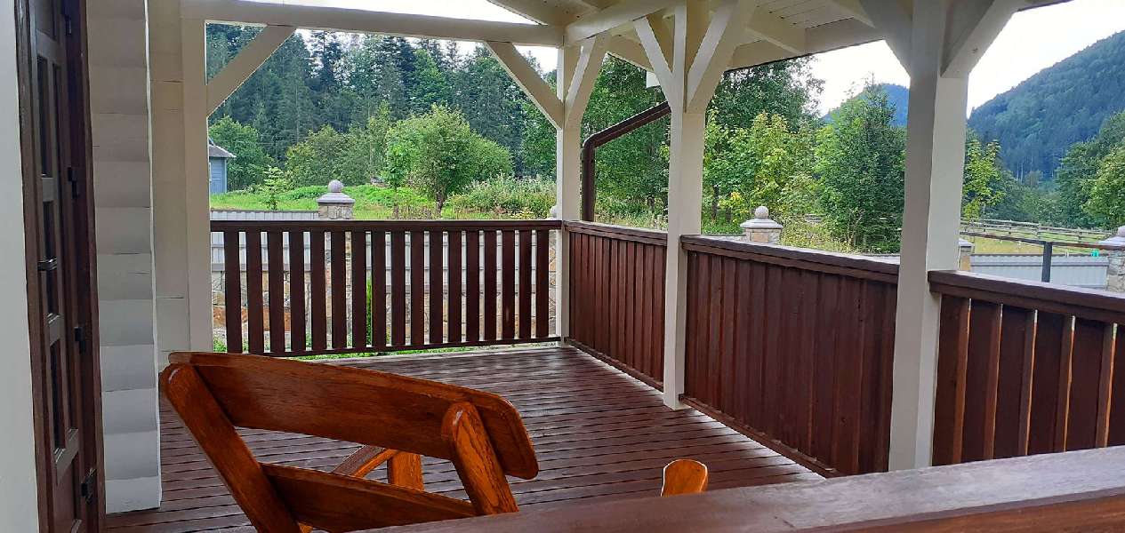 З великої тераси ви матимете неймовірну можливість насолоджуватися краєвидами на гори та красою природи, що оточує цей котедж.