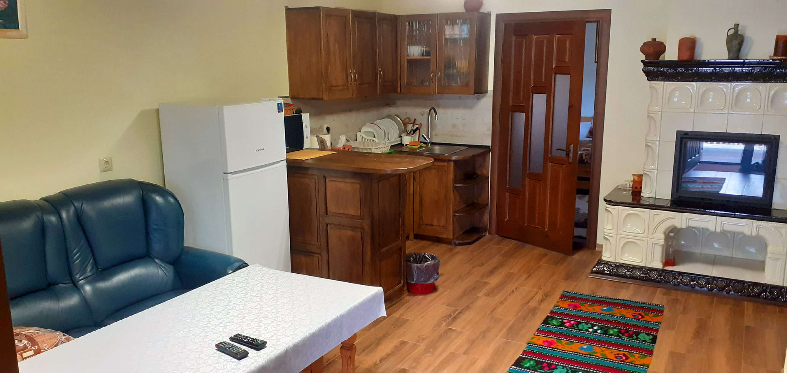 Кухня обладнана всім необхідним для готування смачних страв. Це ідеальне місце для збору всієї родини або друзів під час зимового відпочинку біля каміна.