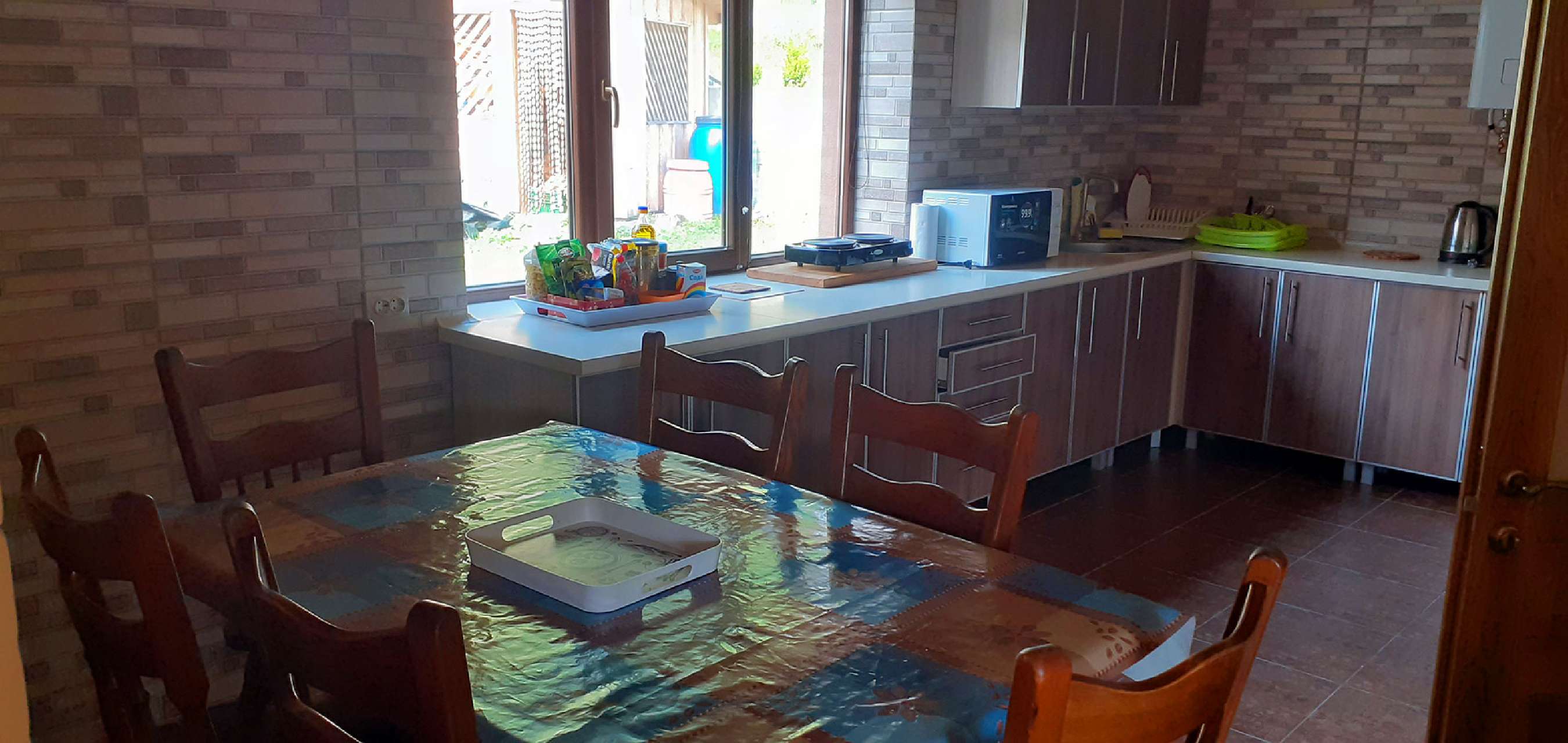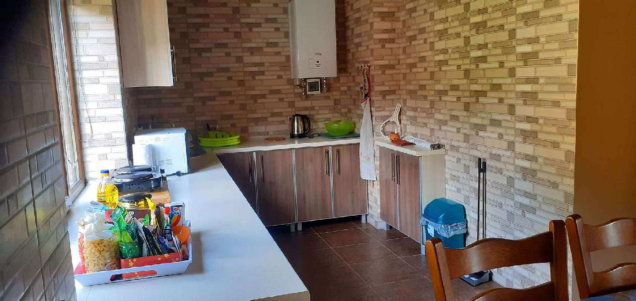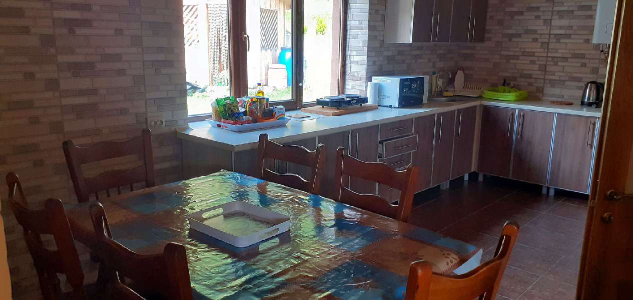 Кухня: Поруч з вітальнею знаходиться повністю обладнана кухня з усіма необхідними приладами і посудом для готування смачних страв. Ви можете приготувати обід або вечерю і подавати їх на обідньому столі вітальні або на вулиці, на терасі.