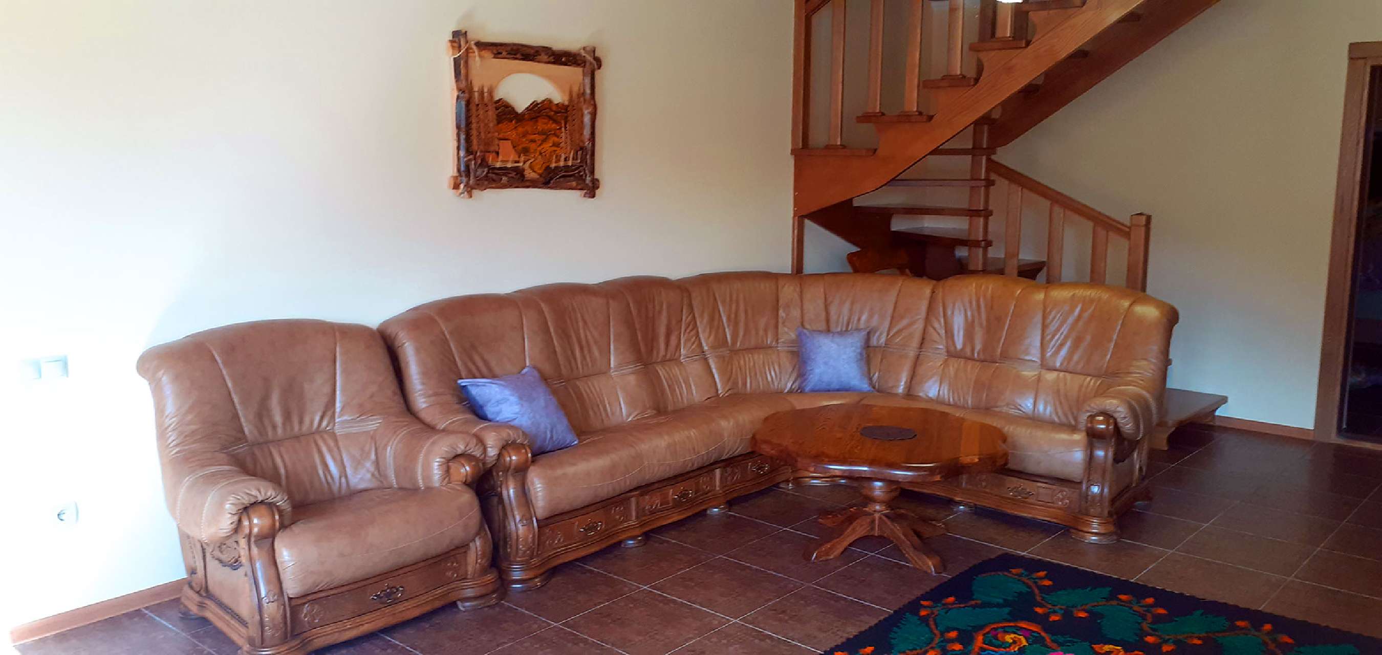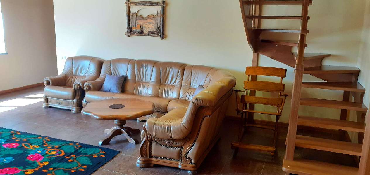 Велика вітальня: Перший поверх вражає своєю великою вітальнею, де розташована зона відпочинку з м'якими диванами, кріслами та великим телевізором. Вітальня - це ідеальне місце для сімейних зустрічей, вечірок або просто для відпочинку після активного дня.